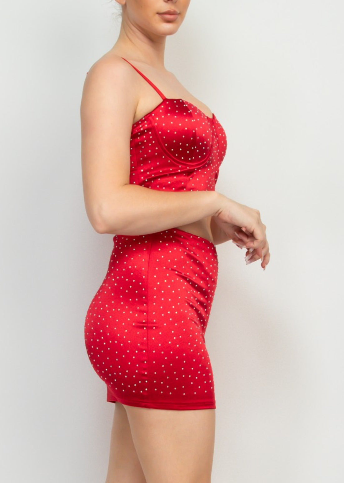 Overall, our rhinestone set is a must-have for anyone looking to add some sparkle and glamour to their wardrobe. With its stretchy material, side zippers, and adjustable straps, this set is both comfortable and stylish. So why wait? Add this stunning piece to your collection today!
