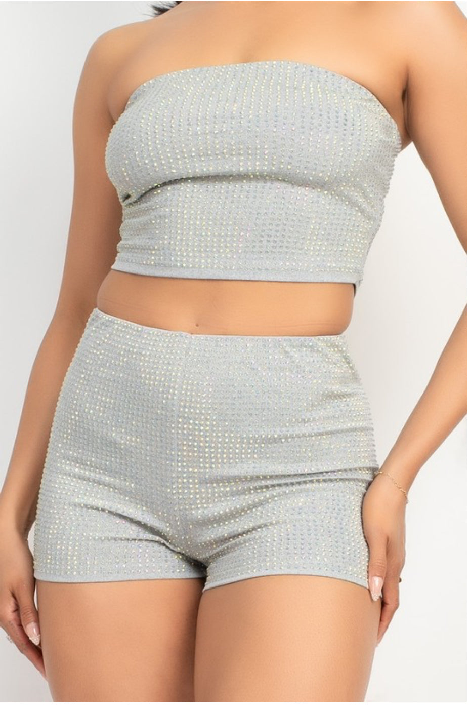 Rhinestone-studded two piece set top and shorts included. Super stretchy.