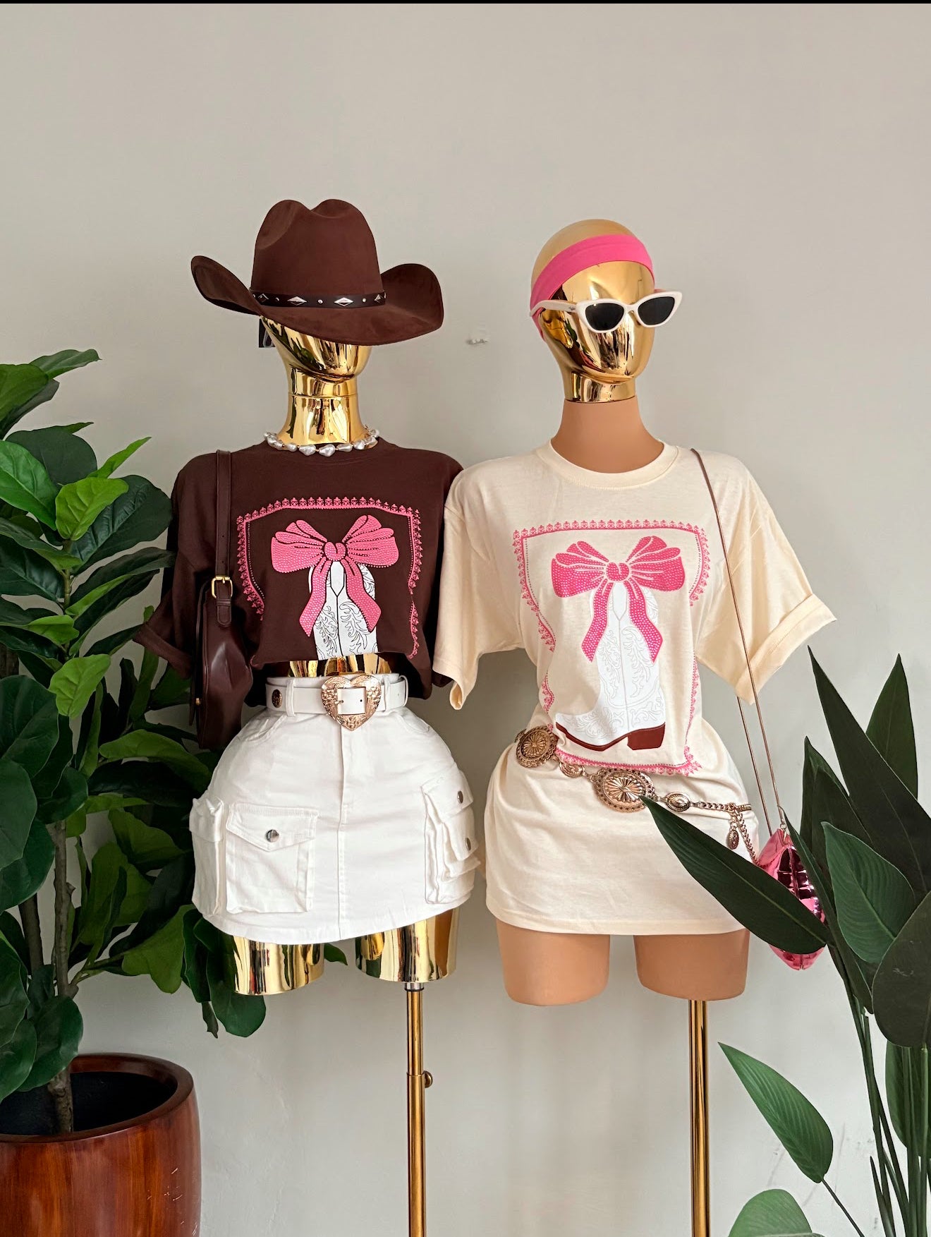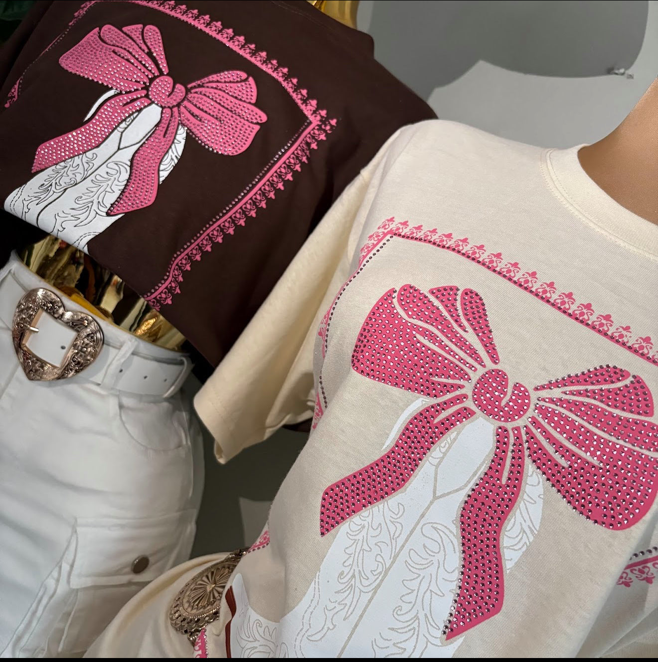 Rhinestone Western Design Oversize Tshirt with boot and Pink Bow detail