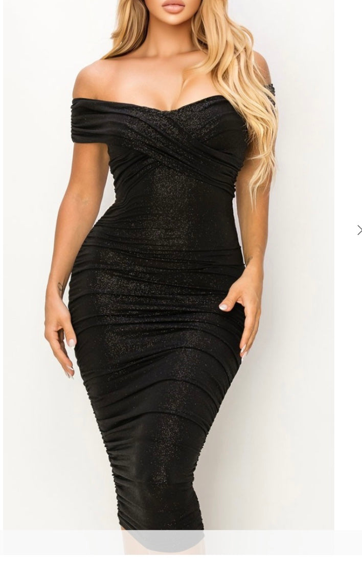 This gold off shoulder cross wrap midi dress is the perfect addition to your wardrobe! The lurex fabric adds a touch of sparkle to your outfit, while the cross wrap design and off shoulder neckline add a flirty and feminine touch.
