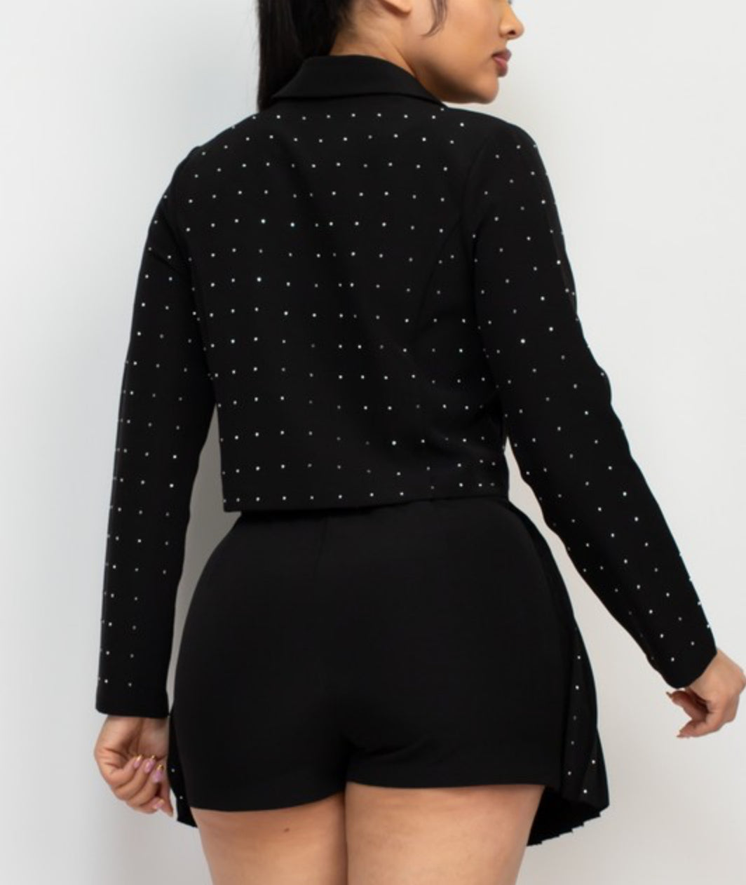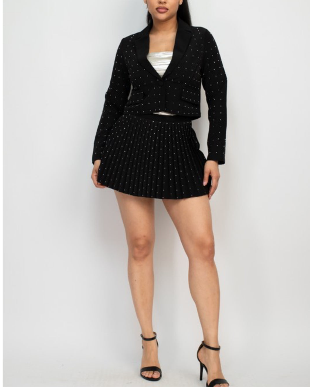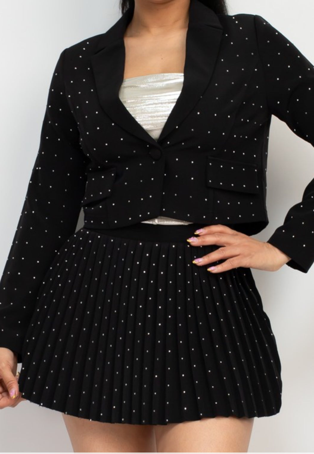 In summary, our rhinestone studded jacket and skort set is a must-have for anyone who wants to add a touch of glamour and sparkle to their wardrobe. The set features a button closure for a secure and comfortable fit, and the rhinestone studs add a unique and eye-catching design to the outfit. Whether you're dressing up for a special occasion or just want to make a statement with your fashion choices, this set is the perfect choice.