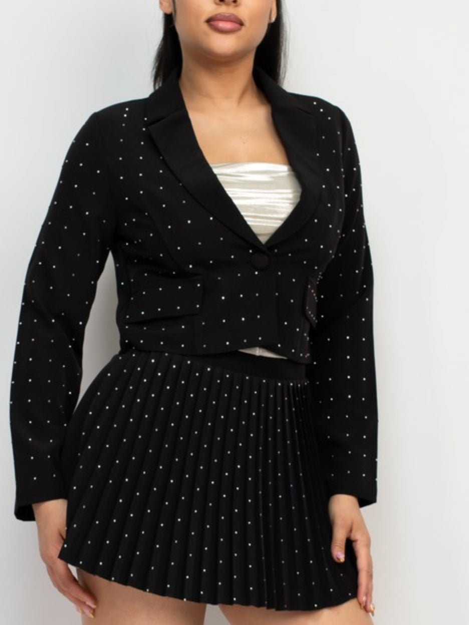 Introducing our rhinestone studded jacket and skort set, a stylish and trendy addition to your wardrobe. The set features a jacket and a skort, both adorned with rhinestone studs that add a touch of glamour and sparkle to the outfit. The button closure on the jacket and skort provides a secure and comfortable fit, ensuring that the outfit stays in place throughout the day.